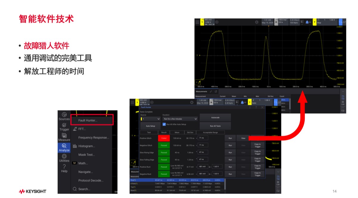 软件能力升级成为另一大亮点。嵌入式系统迁移了Windows示波器的智能功能,如“故障猎人”AI软件,可自动学习波形并设置触发条件,支持长达两天的自动任务,减少工程师手动配置需求。