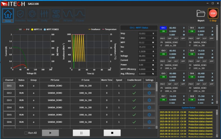 SAS1100的推出建立在SAS1000系列的成功基础上。作为ITECH早期推出的1~20通道阵列模拟器软件,SAS1000系列发布8年来深受市场认可,功能成熟全面,支持动态云遮等复杂工况模拟,内置各国法规报表与批量数据记录/导出功能,提供模板化工况管理与一键复测能力,适配多种太阳能阵列模拟器,广泛应用于逆变器/微逆验证、产线抽检与老化测试等领域。