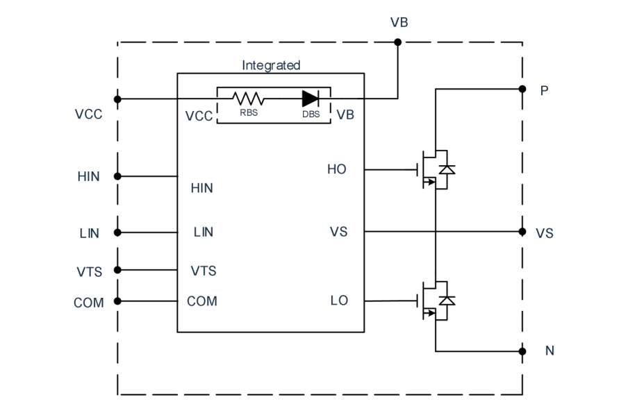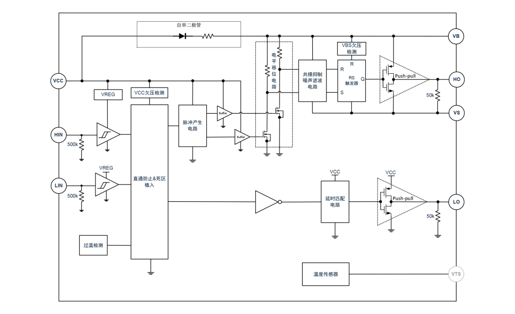 极海首款智能功率模块GHP500N05则代表了集成化突破,它集成了600V耐压栅极驱动器和500V/5A高性能快恢复MOSFET,支持电源电压10V~20V和3.3V/5V逻辑兼容。内置自举二极管和温度传感器,结合直通防止功能及400ns死区时间,确保电路安全稳定;其50V/ns的dvs/dt抗干扰度和VS引脚逻辑运行电压-11V,适应电压快速变化环境,简化外围电路设计,提升整体效率。