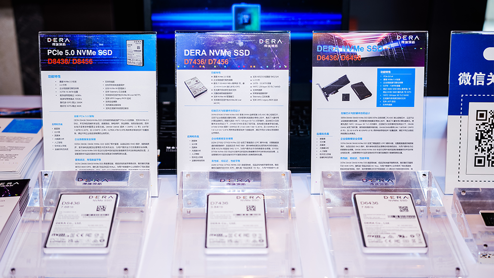 峰会现场,得瑞领新展示了其最新研发的D8000系列高性能企业级SSD。D8436/D8456是得瑞打造的新一代高性能企业级存储产品。DERA依托最新PCIe 5.0前沿架构和YMTC最新一代企业级闪存介质,结合深耕多年的硬件和固件设计技术,实现了这款模组产品从概念、开发到量产的全过程。该产品专为满足数据中心、人工智能、高性能计算等严苛应用场景打造,以极致性能、超低延迟与卓越可靠性,重新定义了企业级存储的标准,为下一代数据中心基础设施提供了强大的存储引擎。