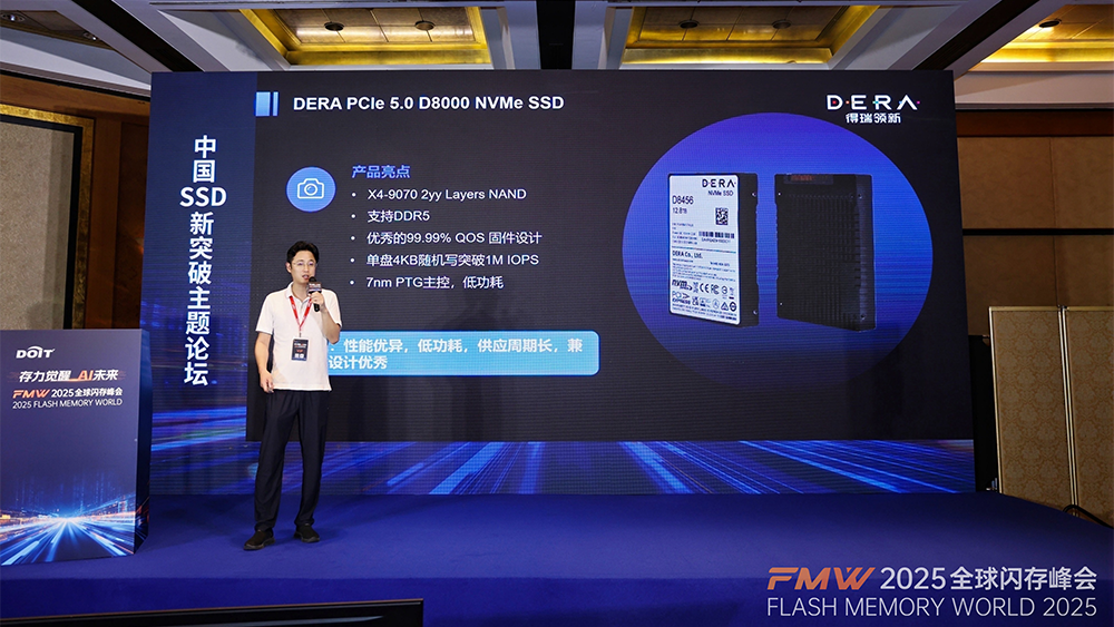 近期,由DOIT传媒主办的2025 FMW全球闪存峰会在南京圆满落幕。本次峰会以 “存力觉醒AI未来” 为主题,汇聚了全球存储领域精英,共同探讨闪存技术如何在人工智能浪潮中赋能数字化转型。国内领先的企业级SSD解决方案创新者得瑞领新(DERA)携重磅产品 PCIe 5.0企业级SSD D8000系列惊艳亮相,并获评“2025年度闪存产品创新奖” ,充分彰显了其在存储核心技术领域的突破性实力。