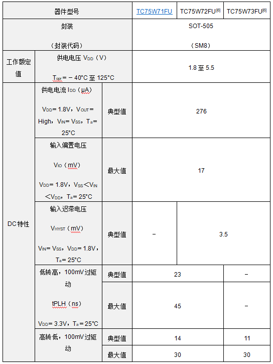 除TC75W71FU外,东芝同步推出增强版产品:TC75W72FU通过增加迟滞性强化抗噪能力,以及TC75W73FU结合迟滞性与开漏输出(支持跨电压域信号传输),计划于2026年2月量产。