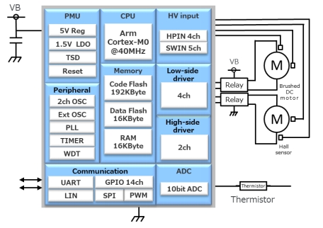 随着汽车电气化趋势加速,辅助设备对控制精度和集成度提出更高要求。东芝的TB9M001FTG应运而生,它内置32位微控制器(基于Arm Cortex-M0内核),工作频率达40MHz,并配备192KB代码闪存、16KB数据闪存和16KB SRAM,支持ECC纠错功能。芯片采用紧凑的VQFN48封装(7mm×7mm),集成四通道低边驱动,可控制两个直流有刷电机的正转和反转,同时提供高边驱动和LIN收发器功能,适应车载电池级电源系统。