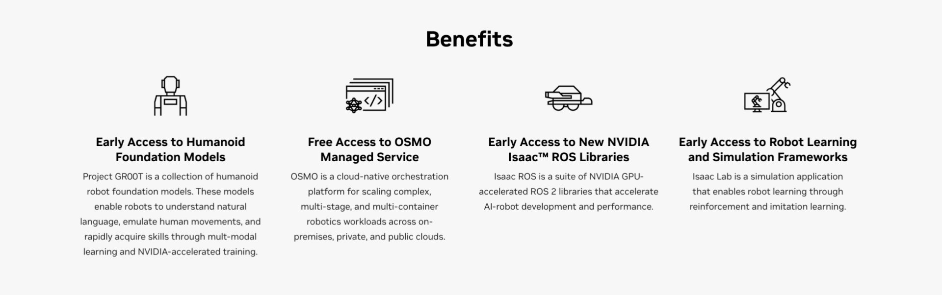 为加速行业应用,英伟达人形机器人开发者计划推出,提供抢先体验资源,包括GR00T基础模型、OSMO托管服务、Isaac ROS库和Isaac Lab框架。