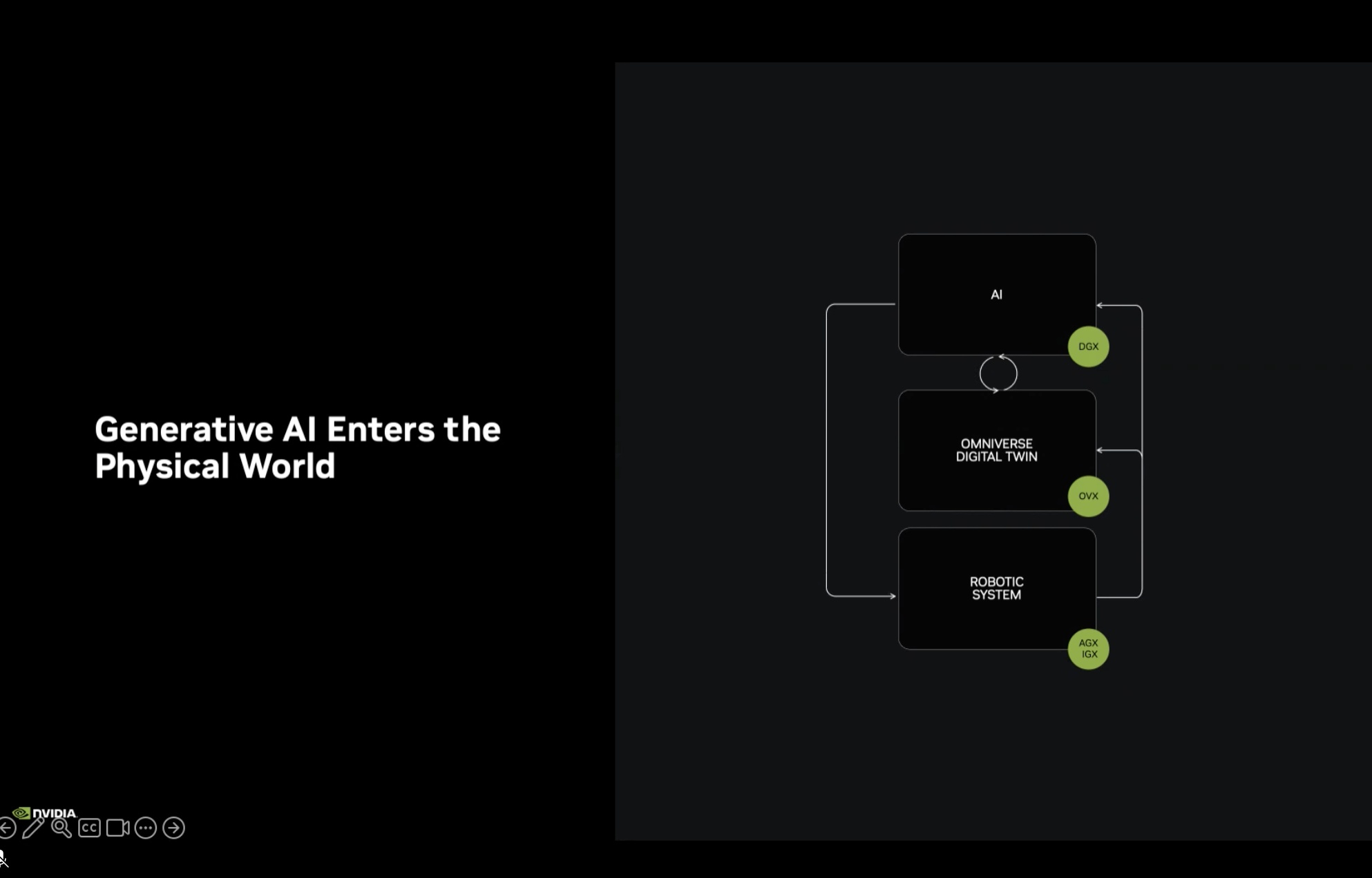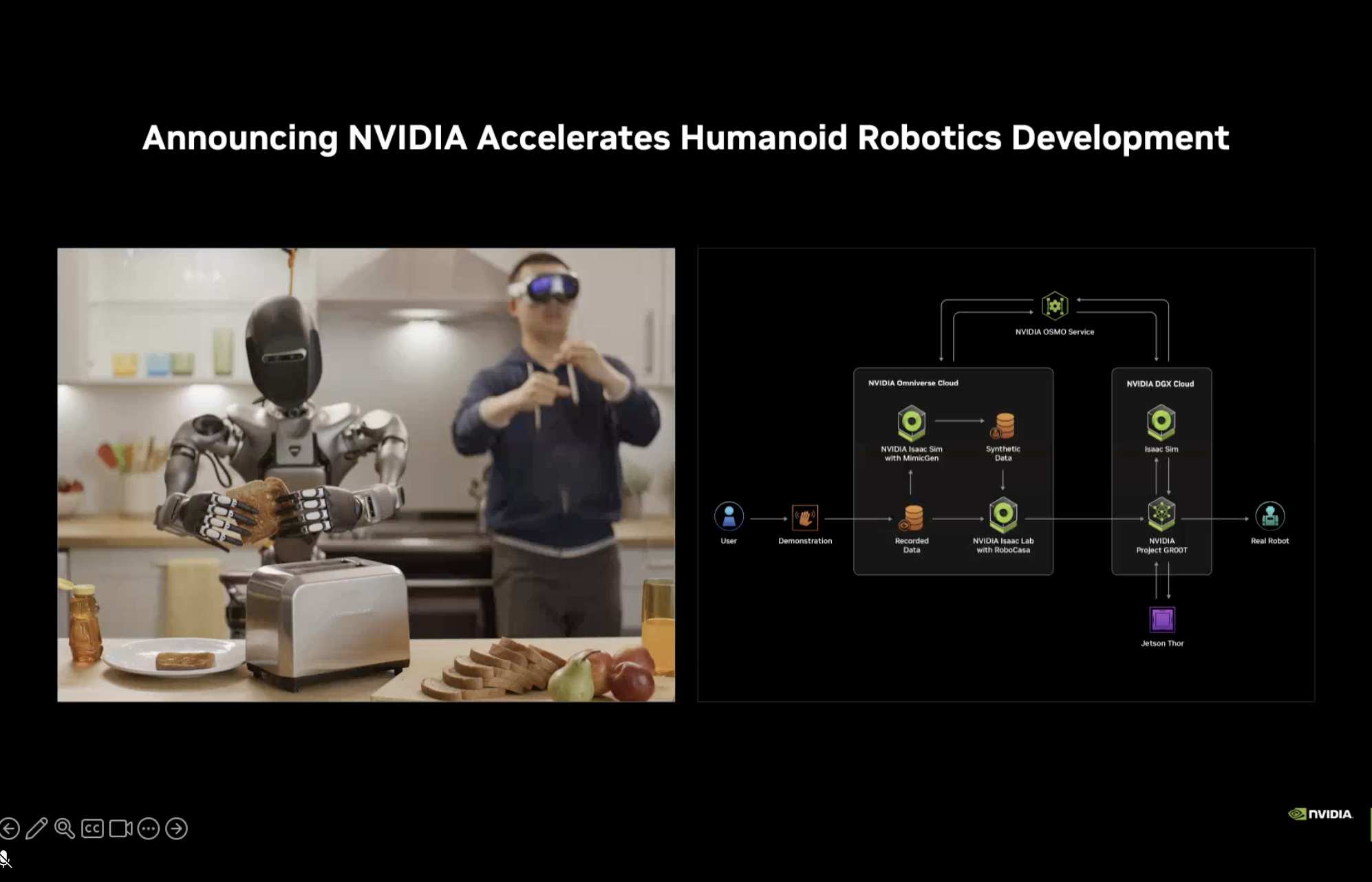 NIM微服务包括MinnicGen和Robocasa,前者基于空间计算设备记录的遥操作数据生成合成运动数据,后者在OpenUSD中模拟任务和环境。这些微服务结合英伟达AI超级计算机、Omniverse构建的Isaac Sim参考应用,以及Jetson Thor人形机器人计算机,打通数字与物理世界界限。