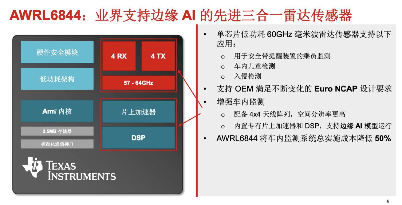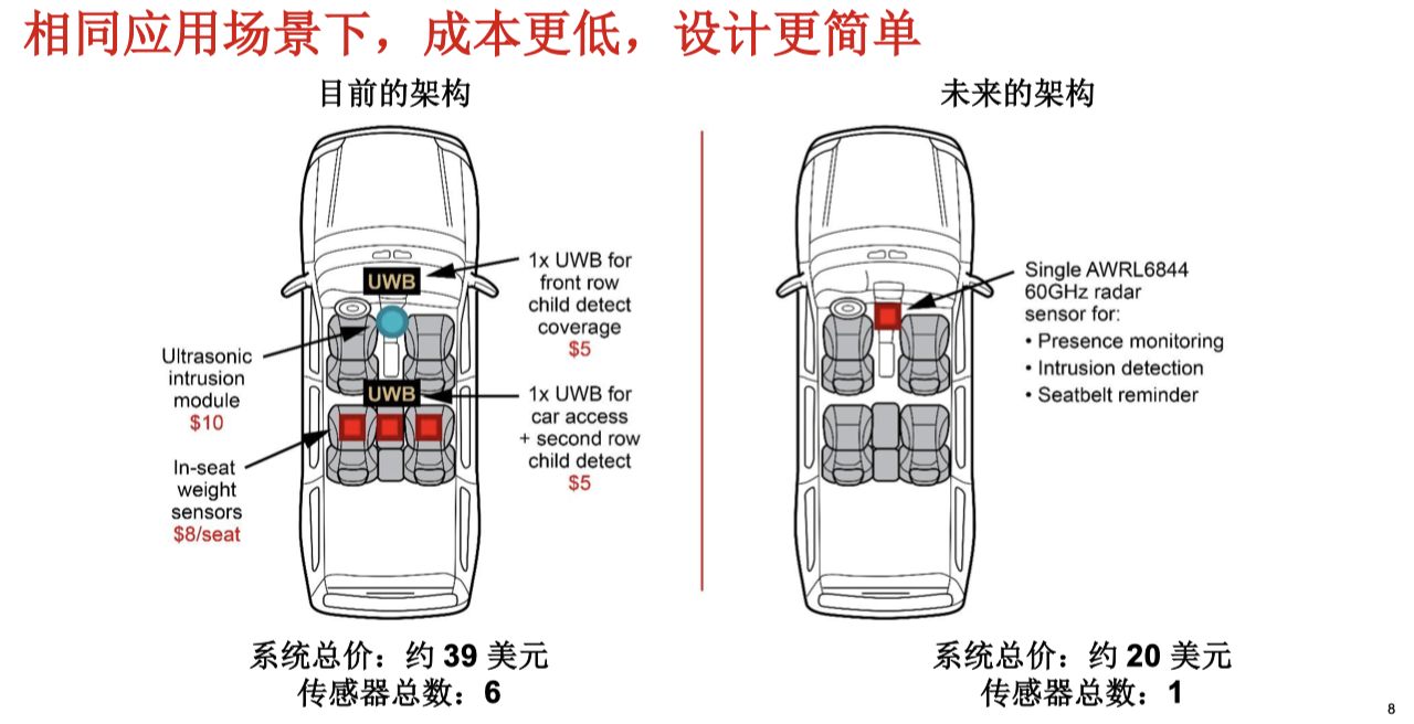 在乘员监测方面,AWRL6844凭借毫米波雷达与AI算法的结合,实现了高达98%的乘客生命体征检测准确率,有效解决传统安全带提醒装置依赖重力传感器导致的误报问题。这不仅提升驾驶安全性,还显著减少驾驶员干扰。市场供应动态显示,该技术正被广泛应用于高端车型中。
