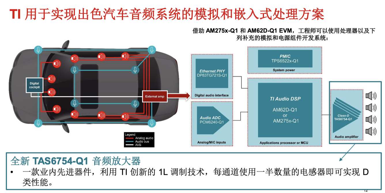 同时,TI推出TAS6754-Q1功放产品,采用独特的单电感器(1L)调制技术,显著降低传统D类功放成本和复杂性。通过简化设计减少元件数量和优化电路布局,实现高效可靠输出。尽管成本大幅降低,该功放仍提供清晰、饱满的音效,支持动态范围控制和音量均衡,确保各类车型中一致的优质体验。行业应用表明,该技术正推动大众车型音频体验升级。