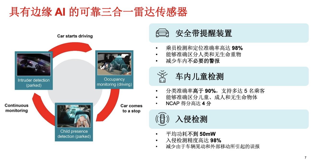 车内儿童检测场景中,芯片通过高精度点云数据和深度神经网络算法,精准识别车内5个以内的成人、儿童及其他无生命体征物体。这满足欧洲NCAP等法规的严格要求,并利用宽视角特性覆盖传统传感器盲区,如脚踏板下或座位外区域,提供更全面的监测方案。渠道动态表明,相关解决方案正通过Xilinx代理渠道推向市场。