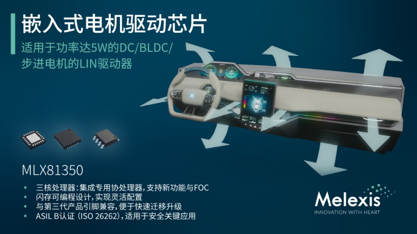 随着电动汽车技术迭代,车内气流与温度的精准控制变得至关重要,直接影响乘客体验和能效。现代车辆普遍配备更多空调风门电机和电子通风口,但工程师在设计中面临多重挑战:需确保电机可靠运行、静音工作,同时简化集成流程并控制成本。MLX81350凭借高压SOI(绝缘体上硅)技术,成功应对这些难题。作为第四代智能LIN电机驱动器,它具备闪存可编程性、高可靠性及高功能密度,降低物料清单(BoM
