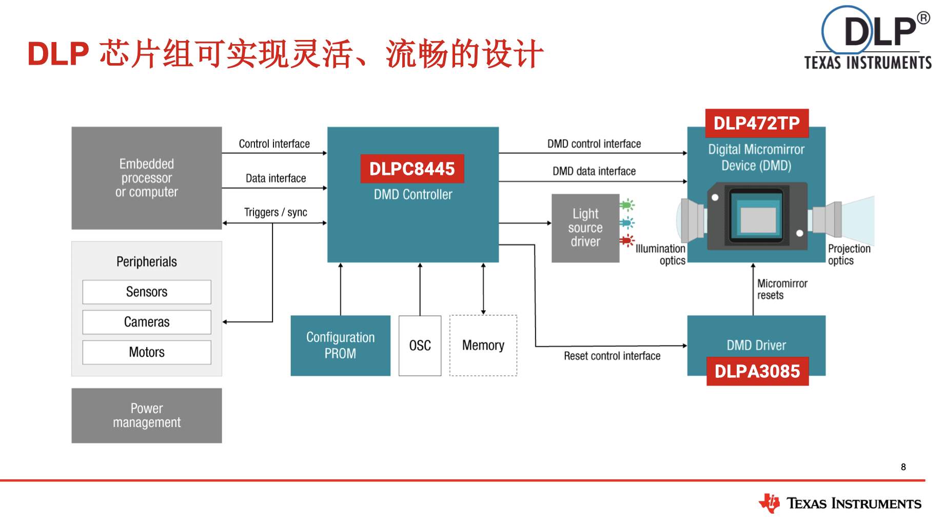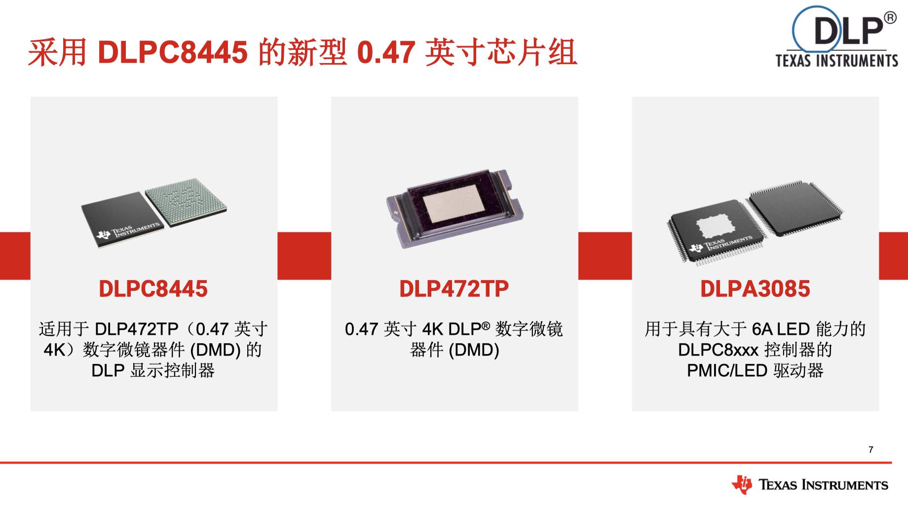 为加速客户开发周期,TI同步推出完整芯片组方案,包含DLP472TP DMD、DLPA3085驱动器及DLPC8445控制器。DLP472TP作为0.47英寸4K数字微镜器件,通过微镜反射生成高分辨率图像;DLPA3085作为PMIC/LED驱动器,支持大于6A LED电力需求,与DLPC8445协同工作,确保系统稳定供电。DLPC8445作为“大脑”,负责数据处理与控制,整合图像、传感器信息及外围输入,灵活调整策略,并兼容智能手机、平板电脑等移动设备接口。在市场供应层面,该芯片组方案减少集成问题,降低开发成本,助力4K UHD投影设计快速落地。