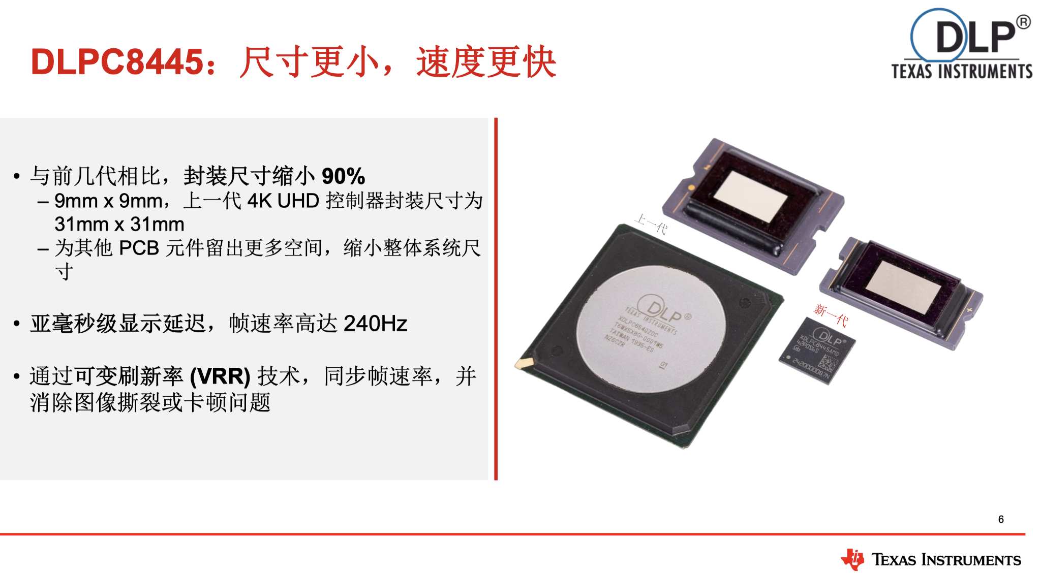 DLPC8445驱动器专为4K高清投影设计,显著提升设备小型化、低功耗和响应速度。其尺寸仅为9mm×9mm(相当于一块小型橡皮擦),成为当前4K驱动平台中最紧凑的芯片,较上一代体积缩小90%,大幅缩减客户PCB电路板尺寸,赋予开发者更大设计灵活性。该控制器不仅支持更大图像画面和更广色域,还通过亚毫秒级显示延迟(低于1毫秒)和240Hz高帧率刷新能力,确保高速动作游戏的流畅体验和即时视觉反馈,有效提升操作精度。在行业应用中,这种低延迟特性正扩展至家庭影院领域,满足用户对更佳观影体验的日益增长需求。