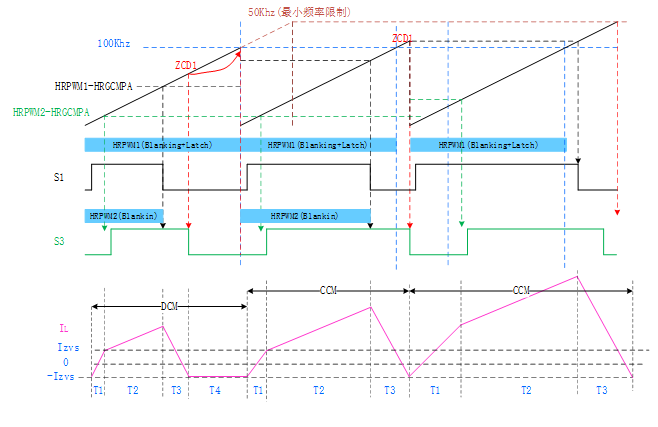 为消除硬件延时导致的功率损耗,参考设计引入电感负电流检测延时补偿机制。HC32F334 HRPWM模块的外部事件处理功能,如事件消隐模式,确保控制精准可靠。系统框图显示,ZCD1信号轻载时决定S3占空比,重载