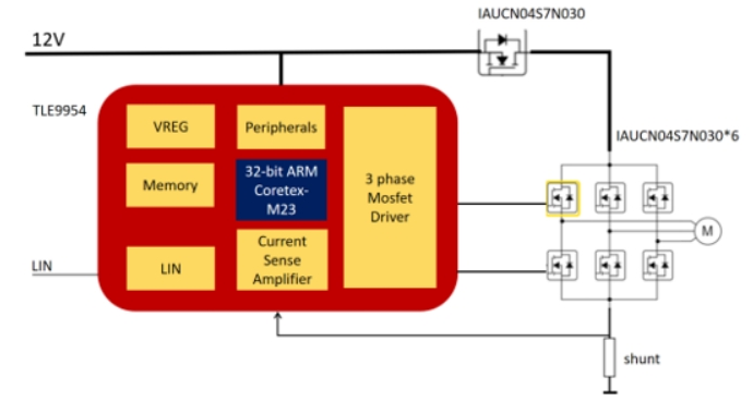 针对车载电机控制的痛点,该方案聚焦于高精度PWM波形生成和场向控制(FOC)算法优化。TLE9954芯片作为核心,采用32位Arm Cortex-M23内核,运行于40MHz主频,并集成72KB闪存和LIN总线接口,满足ASIL-B安全标准。其内置三相桥驱动器可直接驱动电机,减少外部元件依赖,同时支持宽转速范围内的平稳扭矩控制,显著提升12V汽车水泵和风扇的能效。可编程GPIO驱动强度和灵活定时器模块,为生成高精度PWM提供硬件基础,确保在严苛工况下的控制精度。