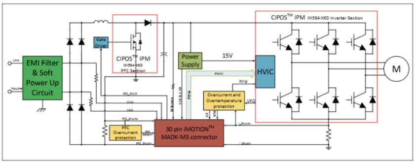 该方案的核心在于英飞凌EVAL-M3-IM564评估板,作为iMOTION模块化应用设计套件的关键组成部分。其电源模块采用高度集成的三相CIPOS Mini智能功率模块(IPM),内置功率因数校正(PFC)功能,专为电机驱动应用优化。通过连接配备M3 30脚位接口的控制板(如EVAL-M3-102T),用户可全面体验CIPOS Mini IPM技术与运动控制引擎(MCE 2.0)的强大性能,轻松驱动永磁电机。在渠道动态方面,此设计简化了评估流程,加速客户前期开发,适用于空调等大型家电及高频开关场景。