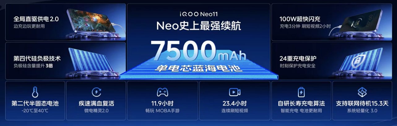 屏幕与续航表现同样旗舰级。Neo11配备6.82英寸2K 144Hz珠峰屏,510 PPI的细腻显示和3200Hz瞬时触控采样率确保指尖响应如闪电。其AR增透膜和圆偏振光护眼技术,结合TV莱茵全局护眼认证,在强光下保持清晰,并缓解眼部疲劳。续航方面,7500mAh超薄蓝海电池采用第四代硅负极技术,容量与厚度平衡;搭配100W超快闪充和全局直驱供电2.0技术,充电高效且边玩边充低温稳定,官方数据显示支持11.9小时连续游戏,彻底告别电量焦虑。这体现了市场供应中,电池技术的突破,满足重度用户需求。