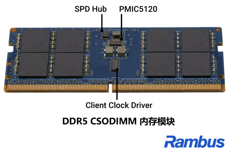 图 2:搭载 Rambus PMIC、CKD 和 SPD Hub 芯片的 DDR5 CSODIMM 内存模块