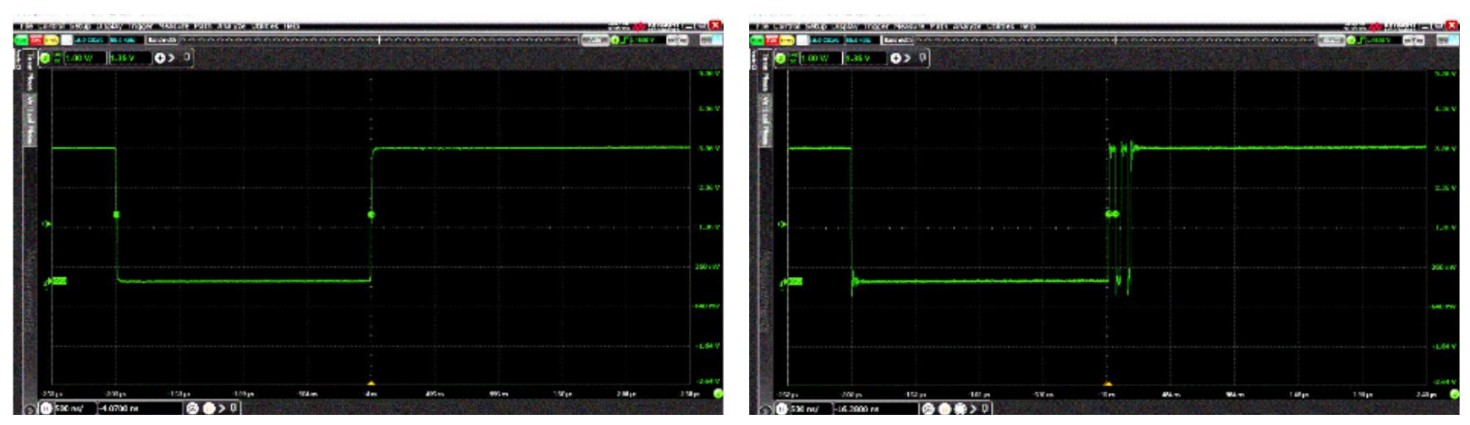 实际测试显示,针对相同的SIC(Signal Improvement Capability)测试信号,普通CAN收发器的接收信号(右)产生了两个震荡尖峰,出现了明显的振铃现象;而SC25042Q的接收信号(左)则保证了信号的一致性和对称性。