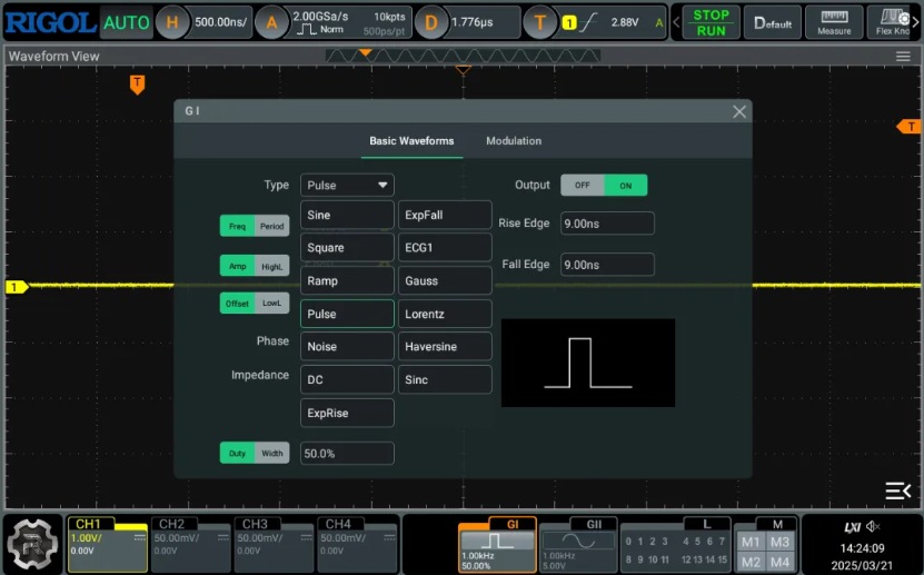 MHO2000系列内置双通道信号发生器,具备16-bit分辨率和50MHz波形输出能力,支持正弦波、方波等多样波形生成。