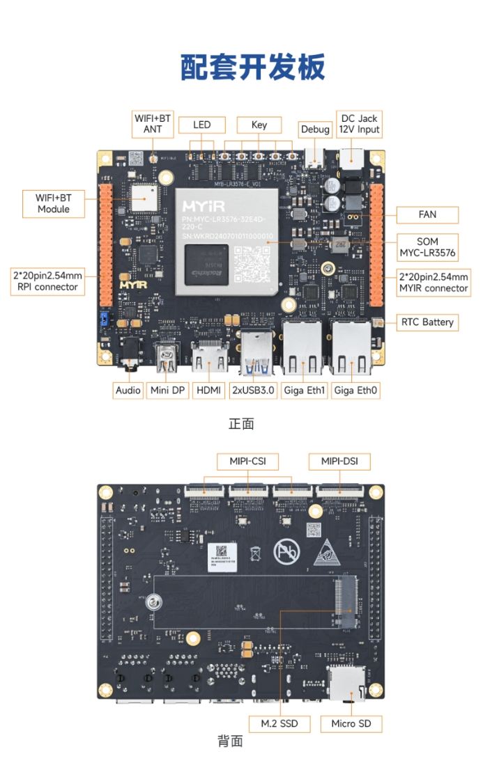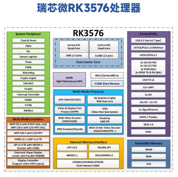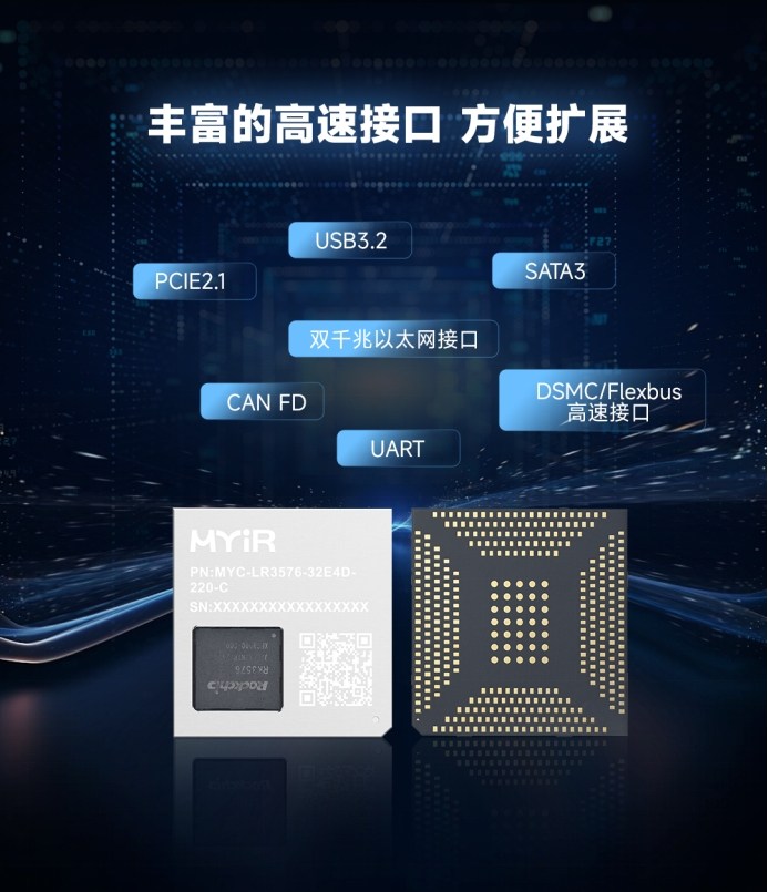 接口扩展性是另一大亮点,RK3576配备双千兆以太网接口、PCIE2.1、USB3.2、SATA3、DSMC/Flexbus、CANFD、UART等丰富接口。