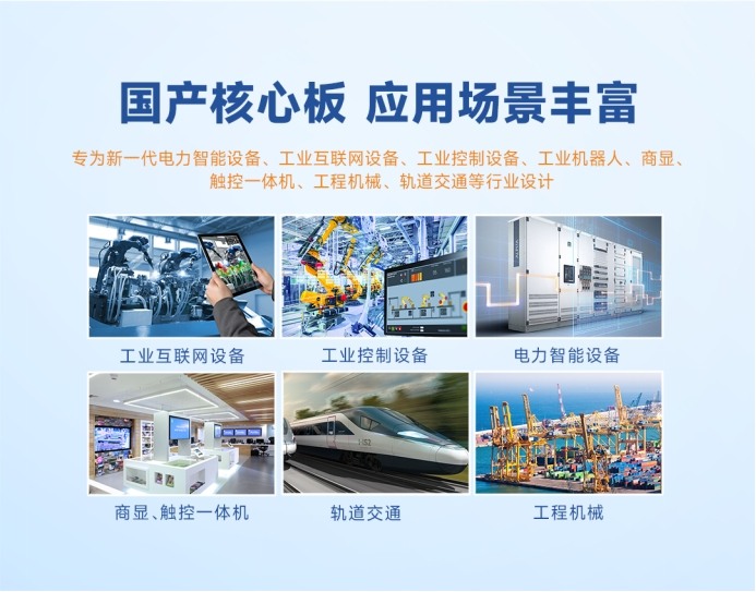 针对具体行业应用,该核心板专为新一代电力智能设备、工业控制设备、工业机器人、商显、触控一体机、工程机械和轨道交通等行业设计。