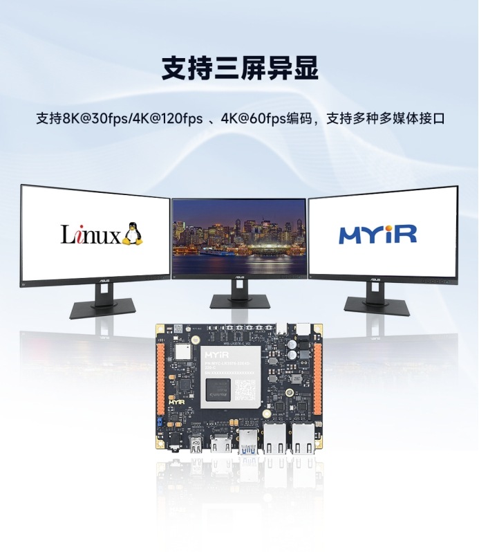 显示与操作体验方面,RK3576支持三屏异显功能,最高可输出4K分辨率视频,并支持8K硬解码,满足多场景多样化显示需求。