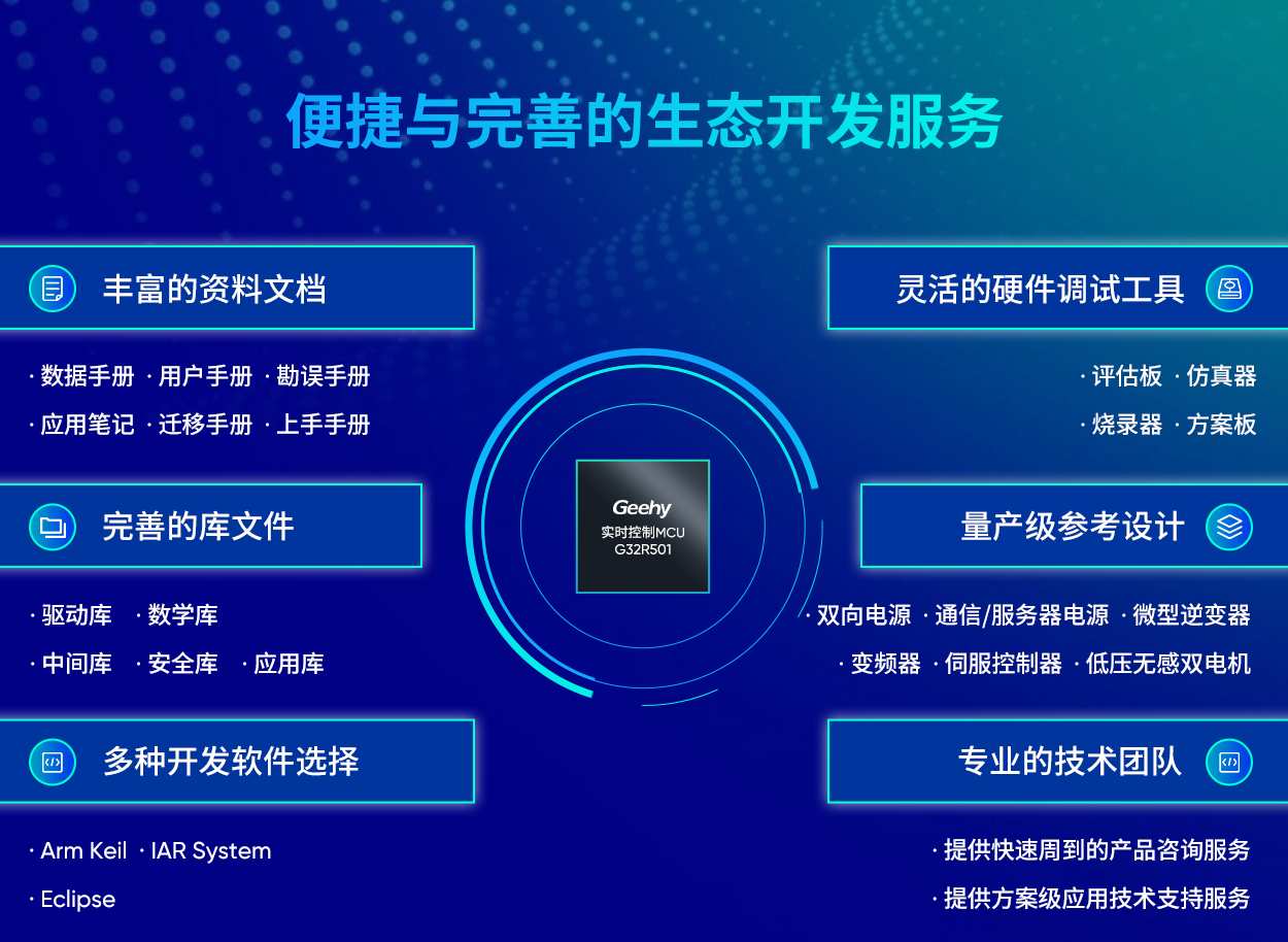 生态支持体系加速产品落地,提供全方位开发资源,包括驱动库、数学库、安全库及兼容KEIL、IAR等IDE工具链。硬件支持涵盖评估板、电机调试板和EtherCAT总线调试板,助力工程师高效开发。极海团队还提供48V/50A双向电源、800W微型逆变器等量产级参考方案,满足多场景应用需求,推动市场供应创新。