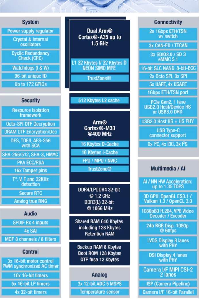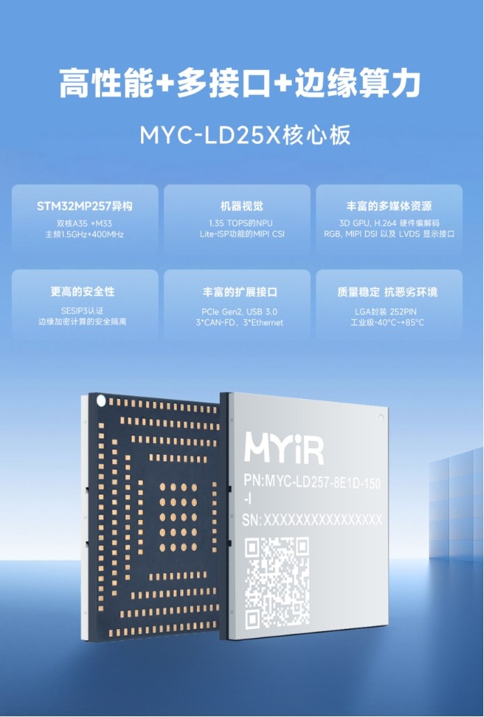 MYC-LD25X核心板采用37mm*39mm高密度高速电路板设计,集成STM32MP257、PMIC等关键元件,确保超高性能与长供货周期。严格的质量标准和丰富外设资源,使其成为高性价比智能设备的理想选择,符合渠道动态中客户对可靠性的高要求。
