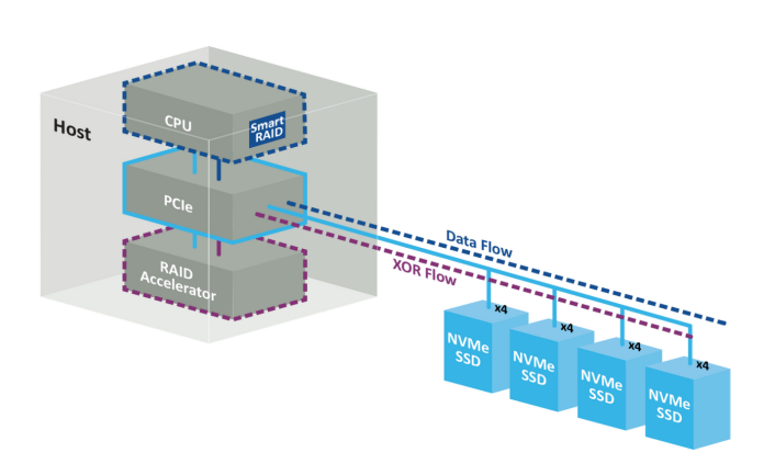 在架构设计上,SmartRAID 4300系列实现了智能存储软件在主机CPU上运行,从而最大化I/O数据流性能。写入操作直接从主机CPU以各自PCIe代际速率传输到NVMe端点设备,而基于奇偶校验的冗余计算(XOR)则从主机CPU卸载到加速器硬件执行。这种创新设计有效克服了传统内联式存储解决方案的固有瓶颈,使加速器具备高度的可扩展性与灵活性,同时支持第4代和第5代PCIe主机CPU,可连接多达32个CPU直连的x4 NVMe设备和64个逻辑驱动器或RAID阵列。