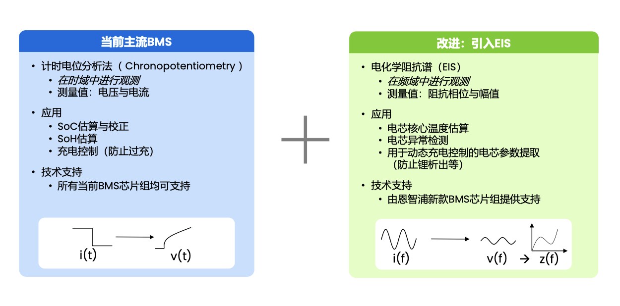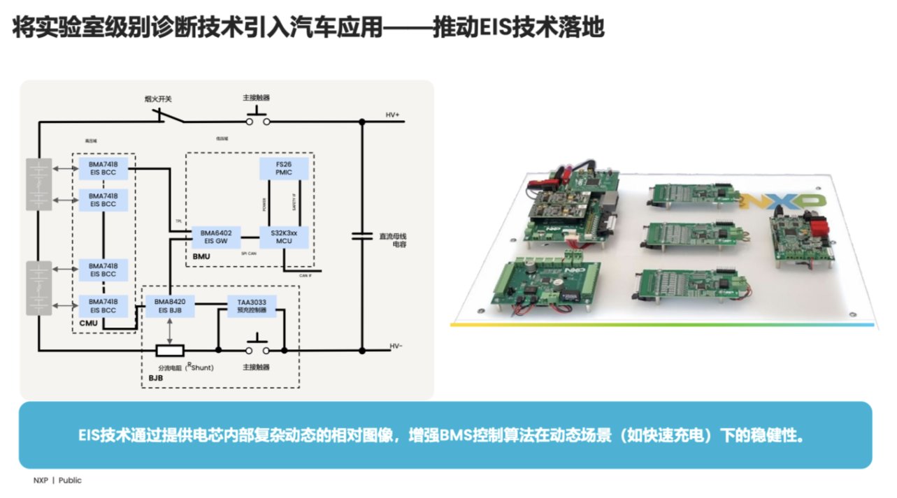 传统电池管理系统依赖电压、电流、电量及外部温度传感器,只能获取电池整体表征,无法实时洞察内部状态。恩智浦的EIS(电化学阻抗谱)技术则通过向电池包注入可控电激励信号,测量电芯响应,生成奈奎斯特曲线,实现内部"切片式"扫描。
