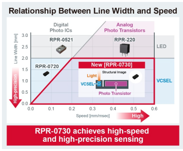 随着工业设备和办公设备向高性能、多功能方向演进,感测技术的精度提升成为关键。标签打印机、样本传送装置和复印机等应用,不仅需要优化生产工艺提升速度,更依赖精准识别技术。RPR-0730凭借10微秒的超高速响应性能,可检测宽度仅0.1mm的微细线体,显著提升了工业应用中的检测效率。作为“RPR-0720”系列的新成员,该产品在旋转检测、打印监测等场景中表现突出,拓宽了行业应用边界。