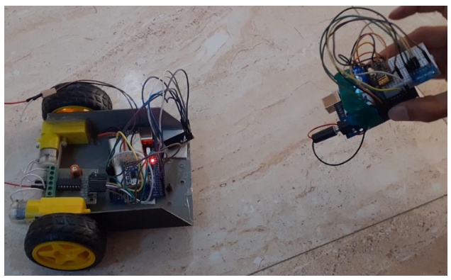 机器人工作原理基于手势识别与无线传输的协同机制。发送端通过MPU6050读取X和Y坐标数据,Arduino处理后经由nRF24L01发射信号;接收端由nRF24L01接收数据,Arduino解析指令并通过L293D电机驱动模块控制电机转向。整个流程实时响应,延迟低于100毫秒,满足工业动态控制需求。这种设计在市场供应中体现为高效人机交互方案,推动自动化技术革新。