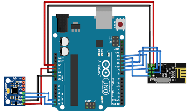 电路设计分为发送端和接收端两部分。发送端电路连接Arduino Uno、MPU6050和nRF24L01,如图所示:MPU6050通过I2C接口接入Arduino,nRF24L01的CE和CSN引脚连接至指定数字引脚。该电路确保传感器数据准确采集和无线发射,在渠道动态中,Xilinx代理商提供兼容模块,简化集成过程。