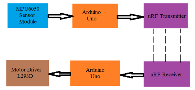 该项目采用模块化设计,分为发送端和接收端两部分。发送端作为遥控器,集成MPU6050传感器和nRF24L01无线模块;接收端则配备电机驱动系统,负责执行动作。核心组件包括:两个Arduino Uno主控板、两个nRF24L01无线收发器、一个MPU6050加速度计与陀螺仪模块、两个直流电机、L293D电机驱动模块及电池供电单元。这些组件在市场供应渠道中易于获取,由Xilinx代理商提供稳定支持,确保项目可靠性和成本效益。