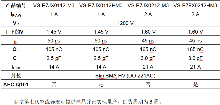 2025年9月30日,全球领先的半导体供应商威世科技Vishay在美国宾夕法尼亚MALVERN和中国上海同步宣布,其第七代1200V FRED Pt超快恢复整流器平台迎来重大扩展,推出了四款创新型号。这些器件包括VS-E7JX0112-M3、VS-E7JX0212-M3,以及通过AEC-Q101认证的VS-E7JX0112HM3和VS-E7JX0212HM3,采用eSMP系列SlimSMA HV(DO-221AC)封装,专为高要求应用场景设计。