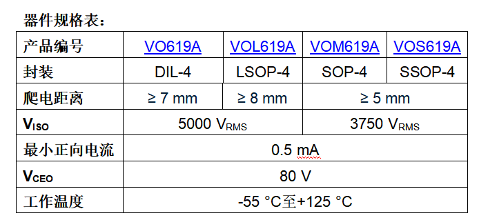 VOx619A系列的核心优势在于其卓越的性能参数。产品支持高线性电流传输比(CTR)和仅0.5 mA的低正向电流,比上一代方案降低50%功耗,能效优化显著。封装选项丰富,包括DIL-4、长爬电距离型LSOP-4、紧凑型SOP-4和半间距SSOP-4,满足不同电路板空间需求。高温工作环境支持高达+125°C,确保在极端工业条件下的可靠性能,为渠道动态提供更多应用可能。