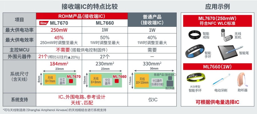 此次推出的芯片组基于ROHM广受好评的ML7660/ML7661系列进行优化开发,将最大供电量调整为250mW,更符合小型设备的实际需求。ML7670接收端IC在保持2.28mm×2.56mm×0.48mm超小尺寸的同时,实现了45%的供电效率。通过优化线圈匹配、整流电路设计以及降低开关器件损耗,该芯片组在同等功率输出条件下展现出超越行业平均水平的能效表现。特别值得一提的是,芯片内部已集成无线供电所需固件,无需外置主控MCU,为开发者节省了宝贵的PCB空间和开发周期。