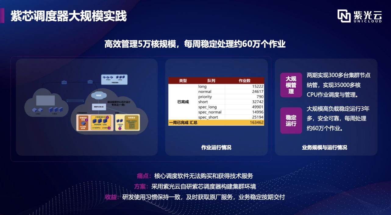 核心竞争力源于两大自研软件:CAD管理平台和紫芯调度器。CAD管理平台专为芯片设计行业定制,实现对计算、网络、存储和安全资源的统一纳管与可视化,提升资源利用率。紫芯调度器则高效调度业务任务,支持大规模资源管理,操作体验与国际领先厂商一致,确保资源高效利用。